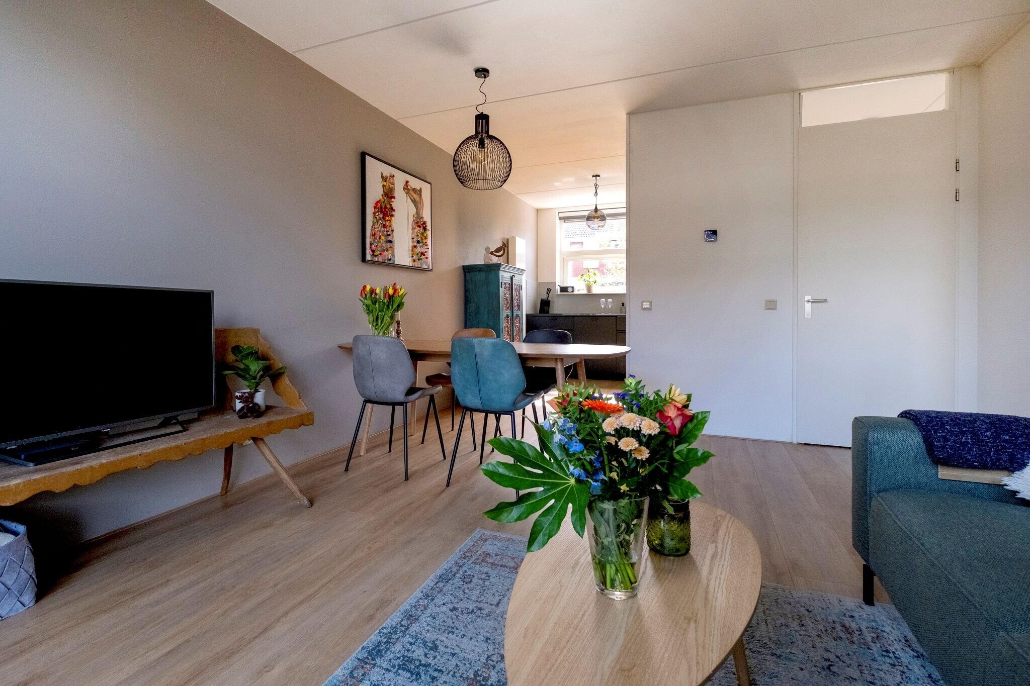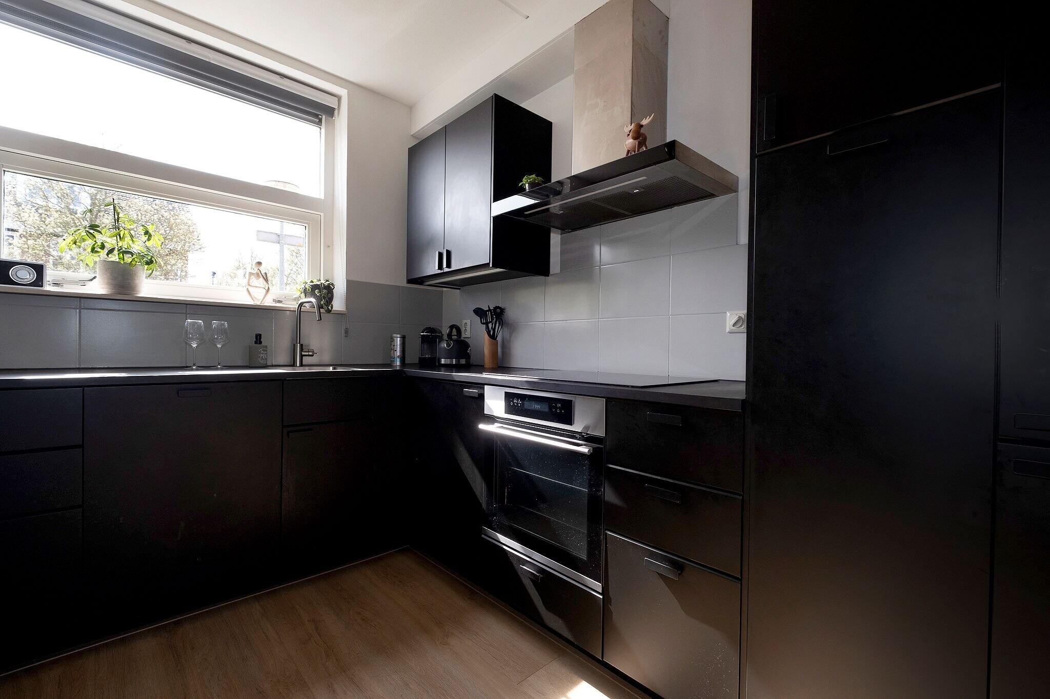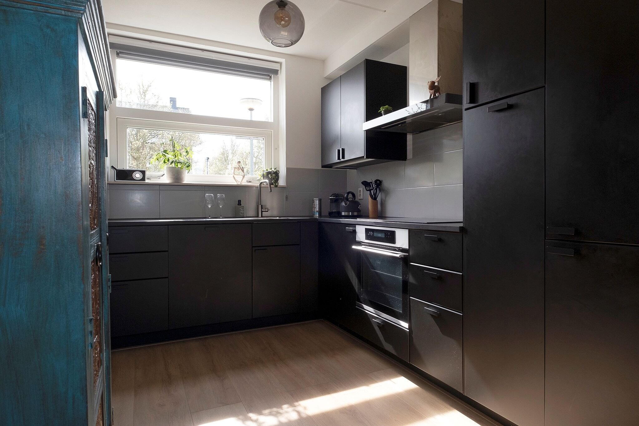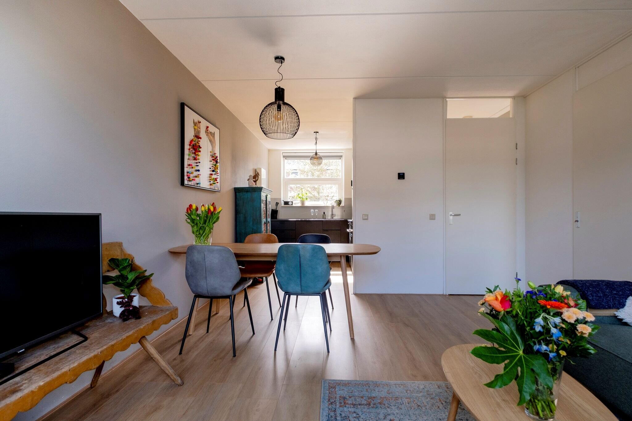 Woonkamer met open keuken (2022) met inbouwapparatuur (tezamen ca. 32 m²), veel lichtinval en trapkast met waterontharder (2021);