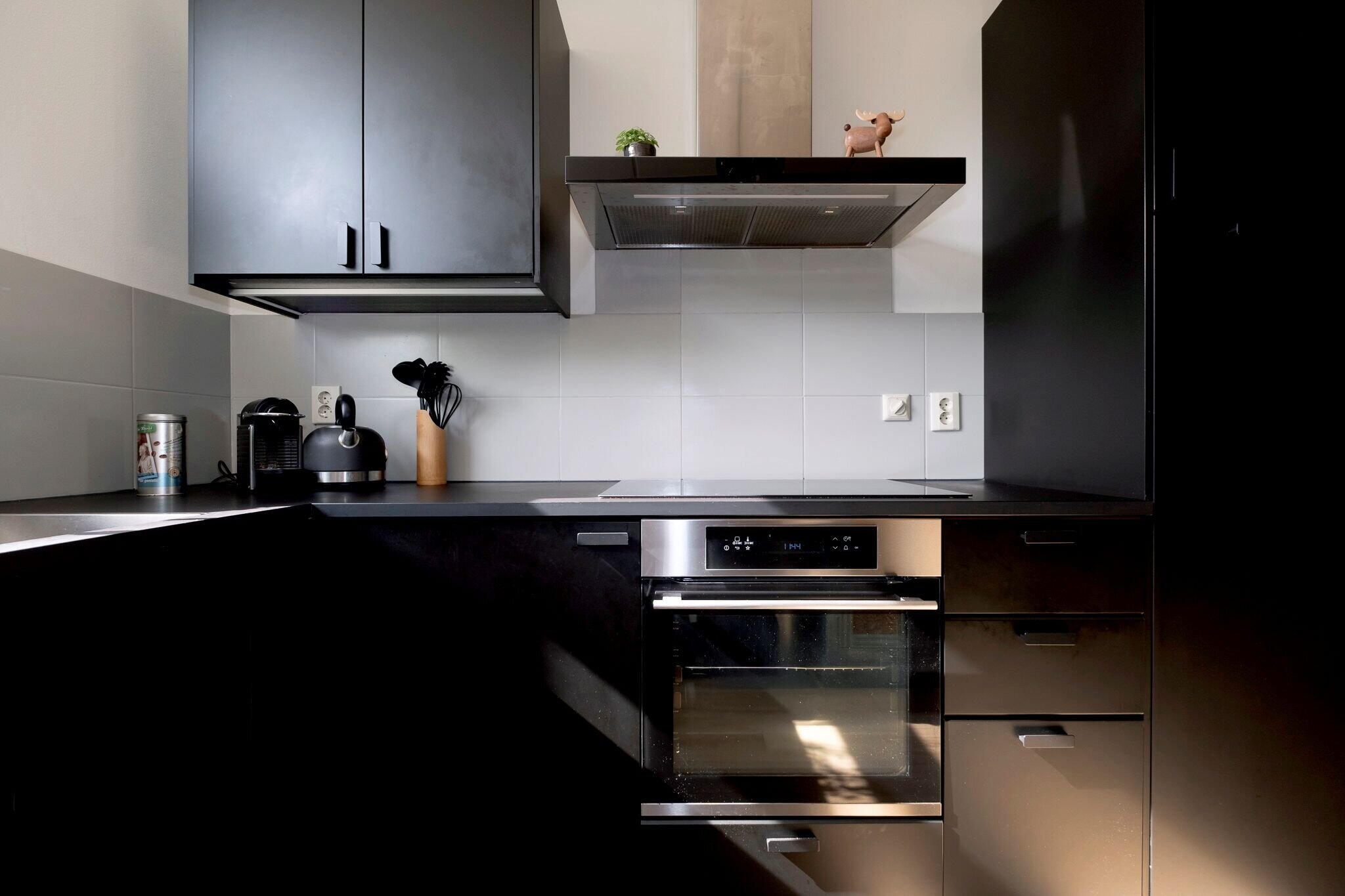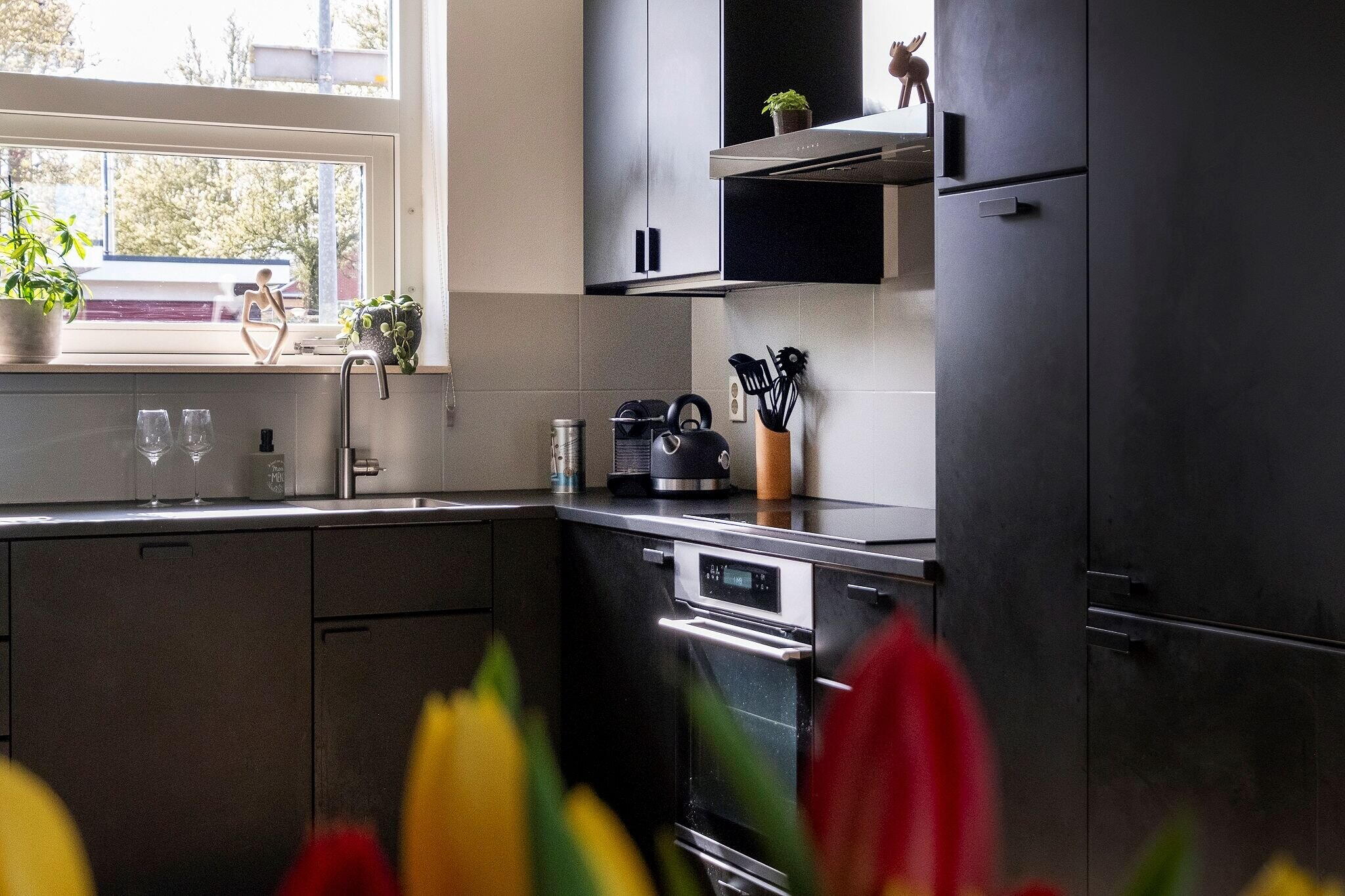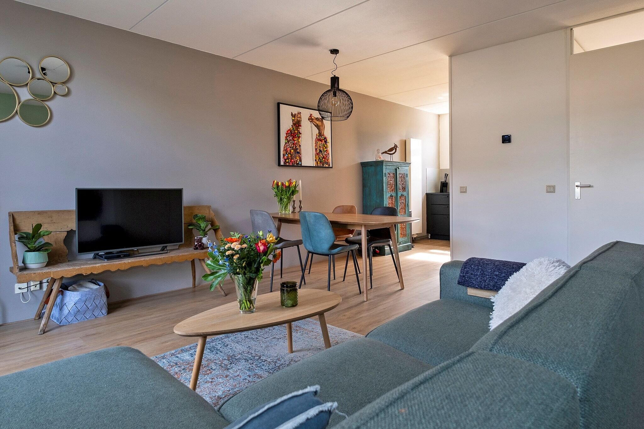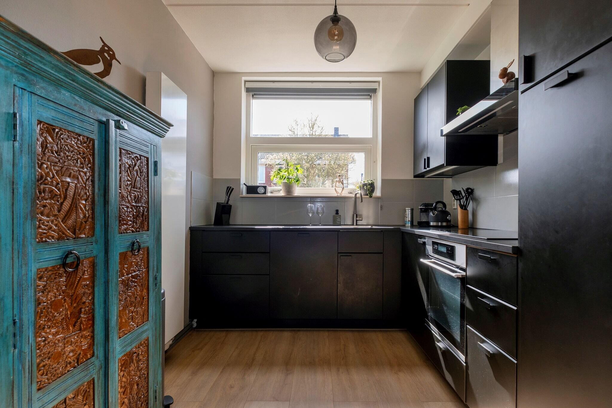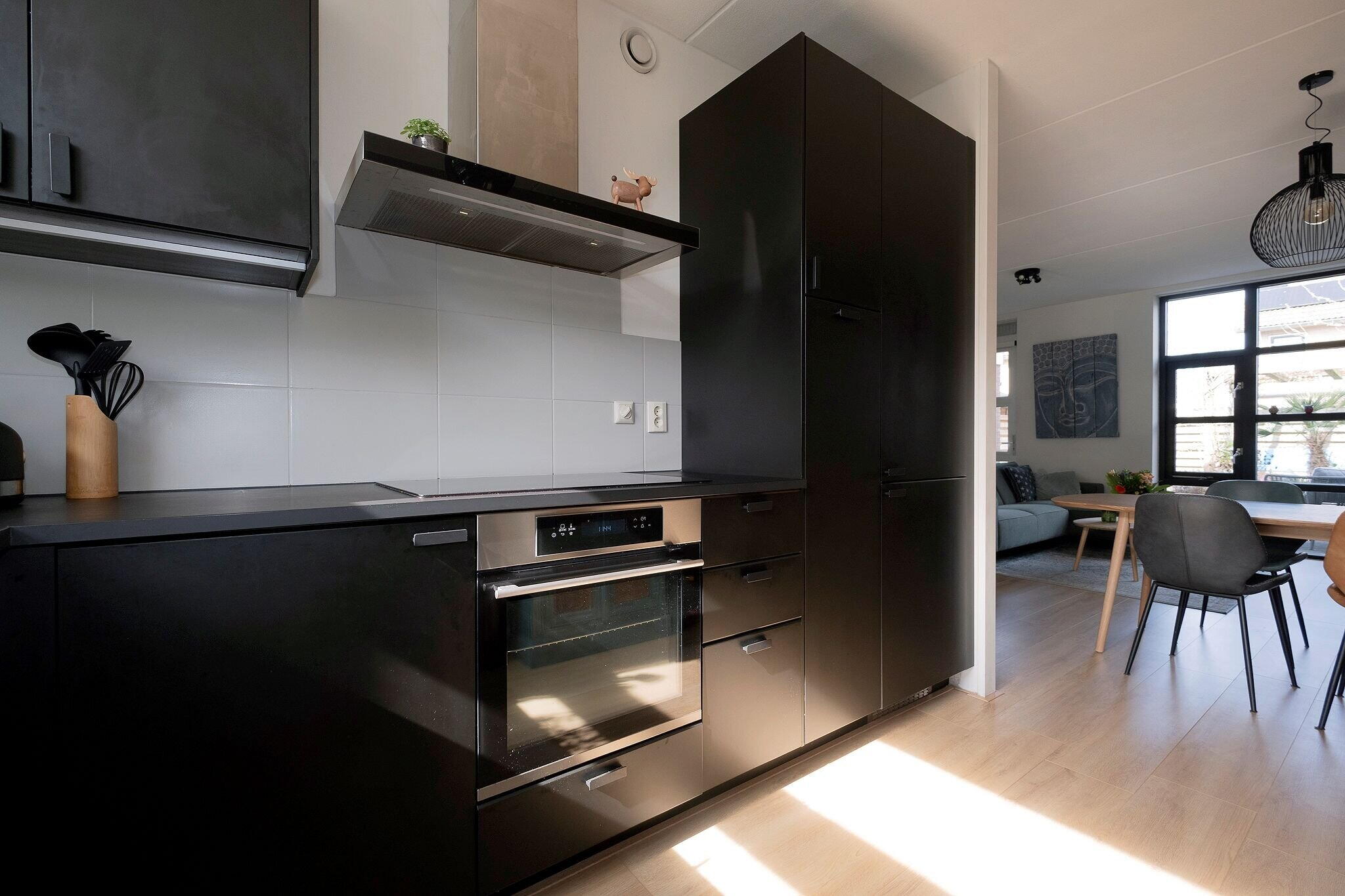 Woonkamer met open keuken (2022) met inbouwapparatuur (tezamen ca. 32 m²), veel lichtinval en trapkast met waterontharder (2021);