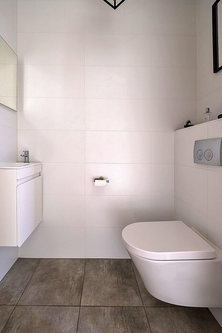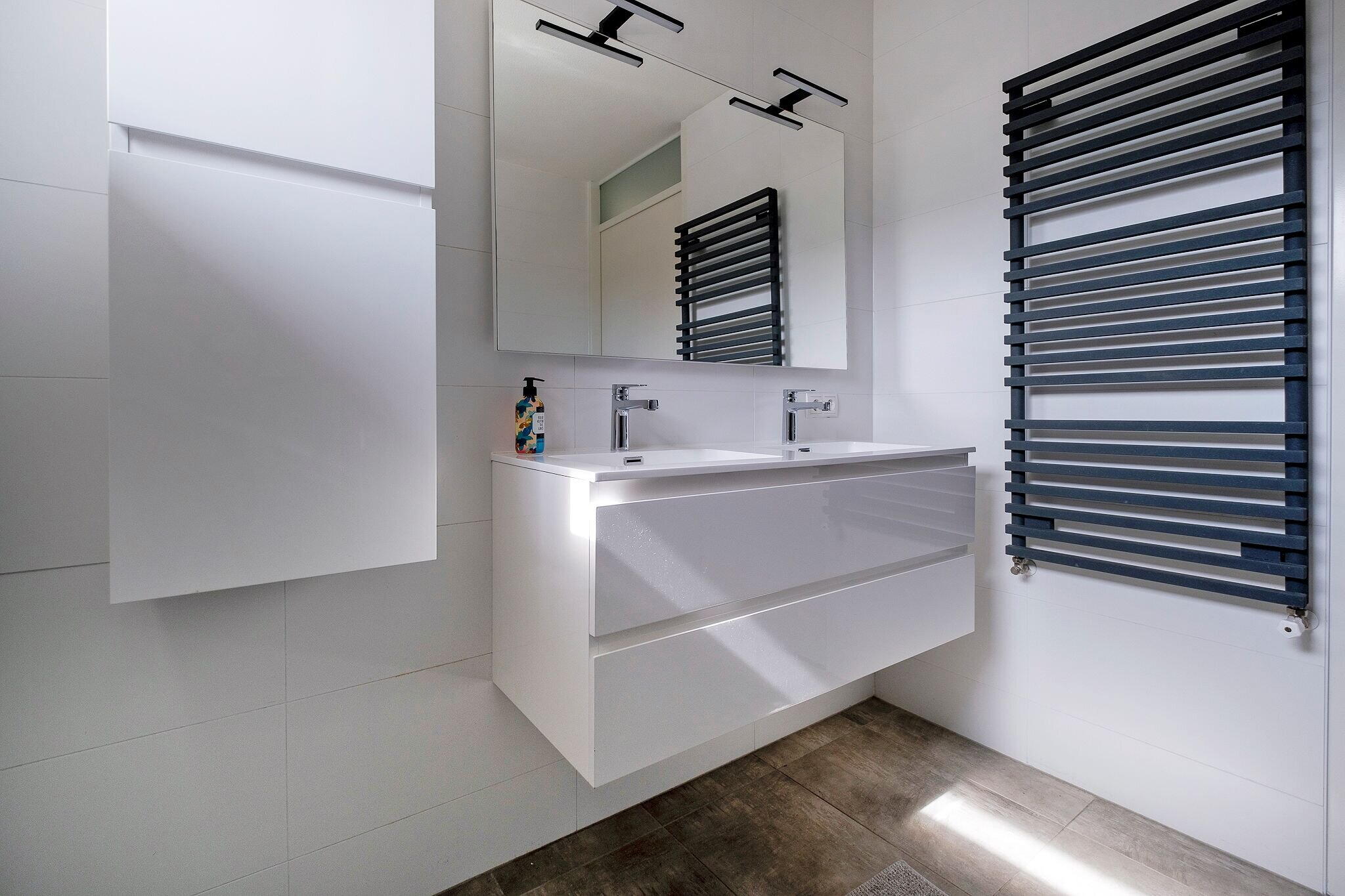 - Dubbele wastafel, inloopdouche, toilet, en wastafelmeubel
